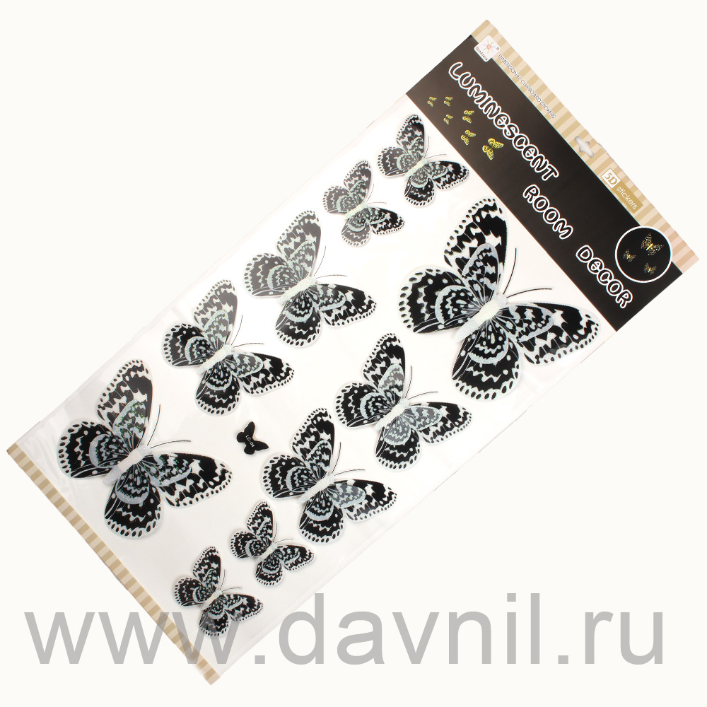 Бабочки декоративные 5D на липучке с блёстками 10 шт. чёрно-белые