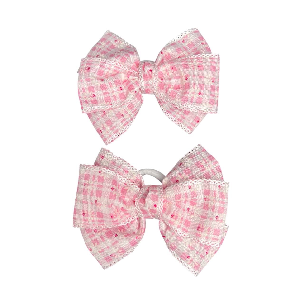 Бант для волос на резинке 8 см розовая клетка в цветочек 2