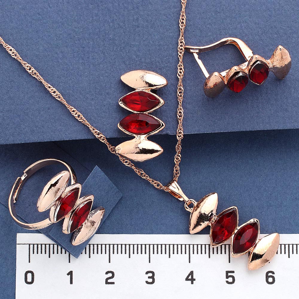 Набор серьги кулон на цепочке кольцо под золото с красными стразами