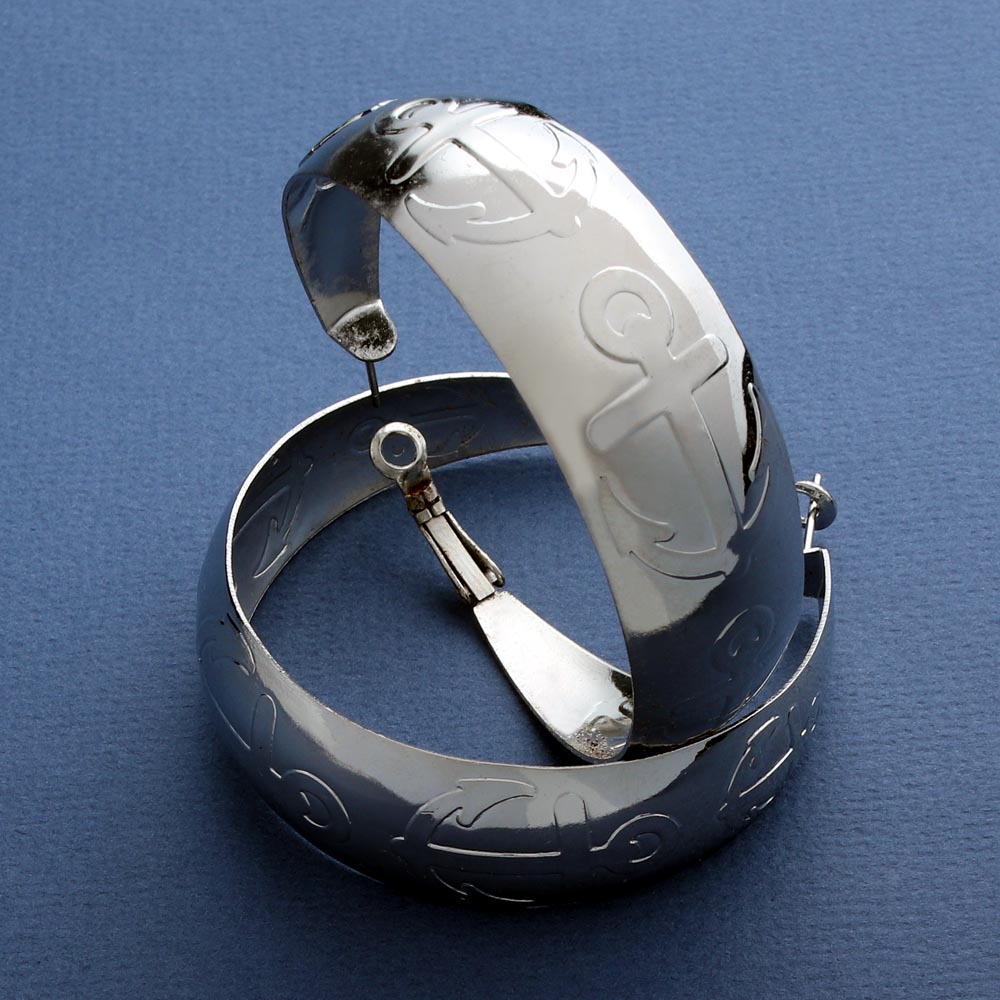 Серьги-кольца широкие под серебро с рисунком якоря №3