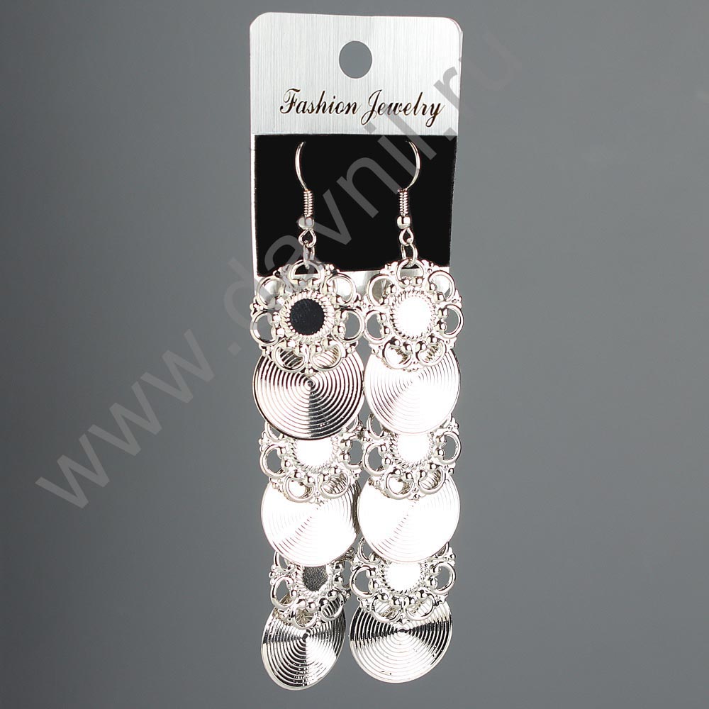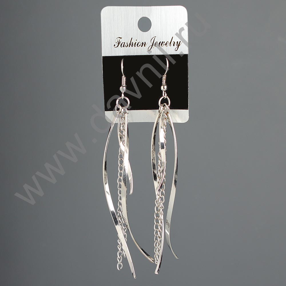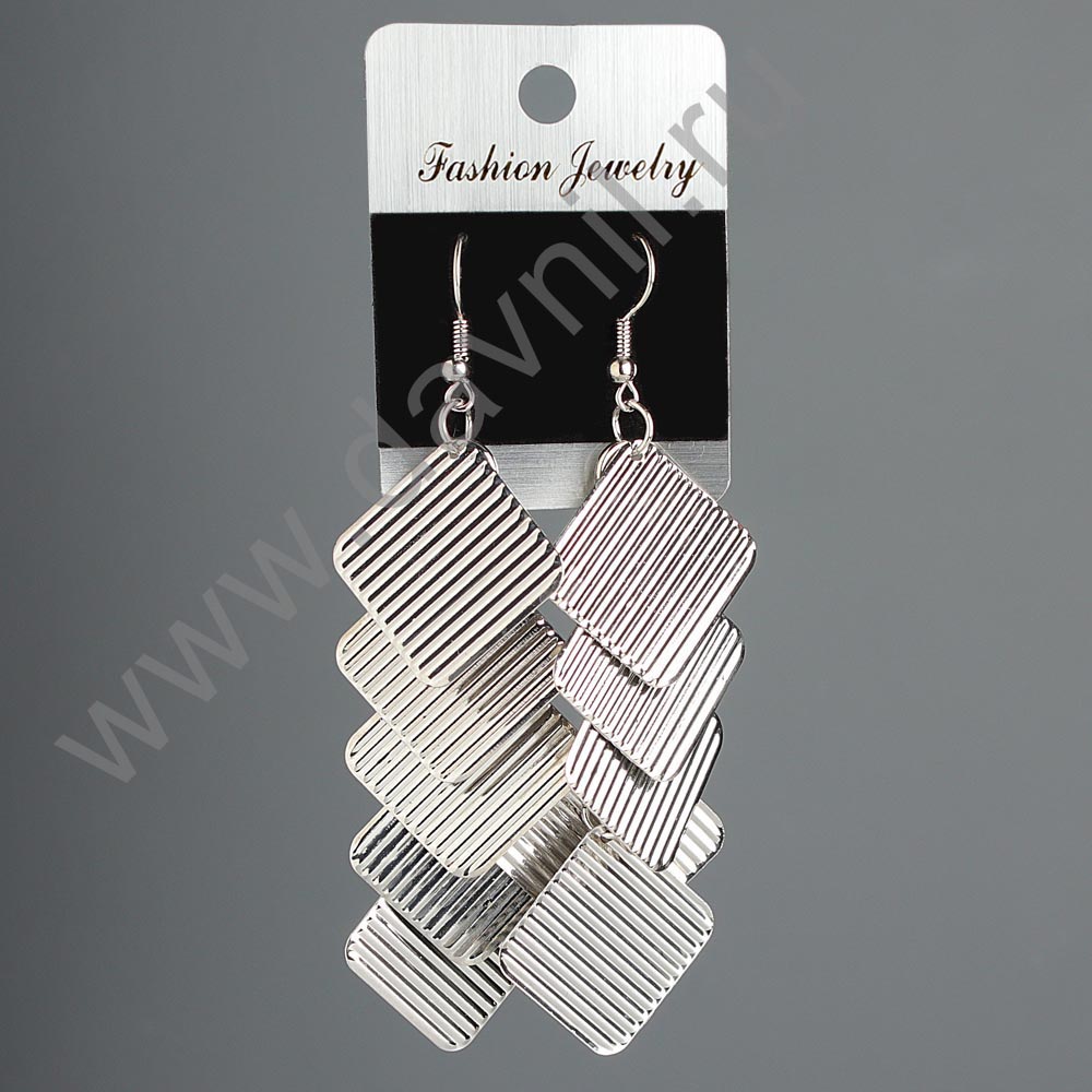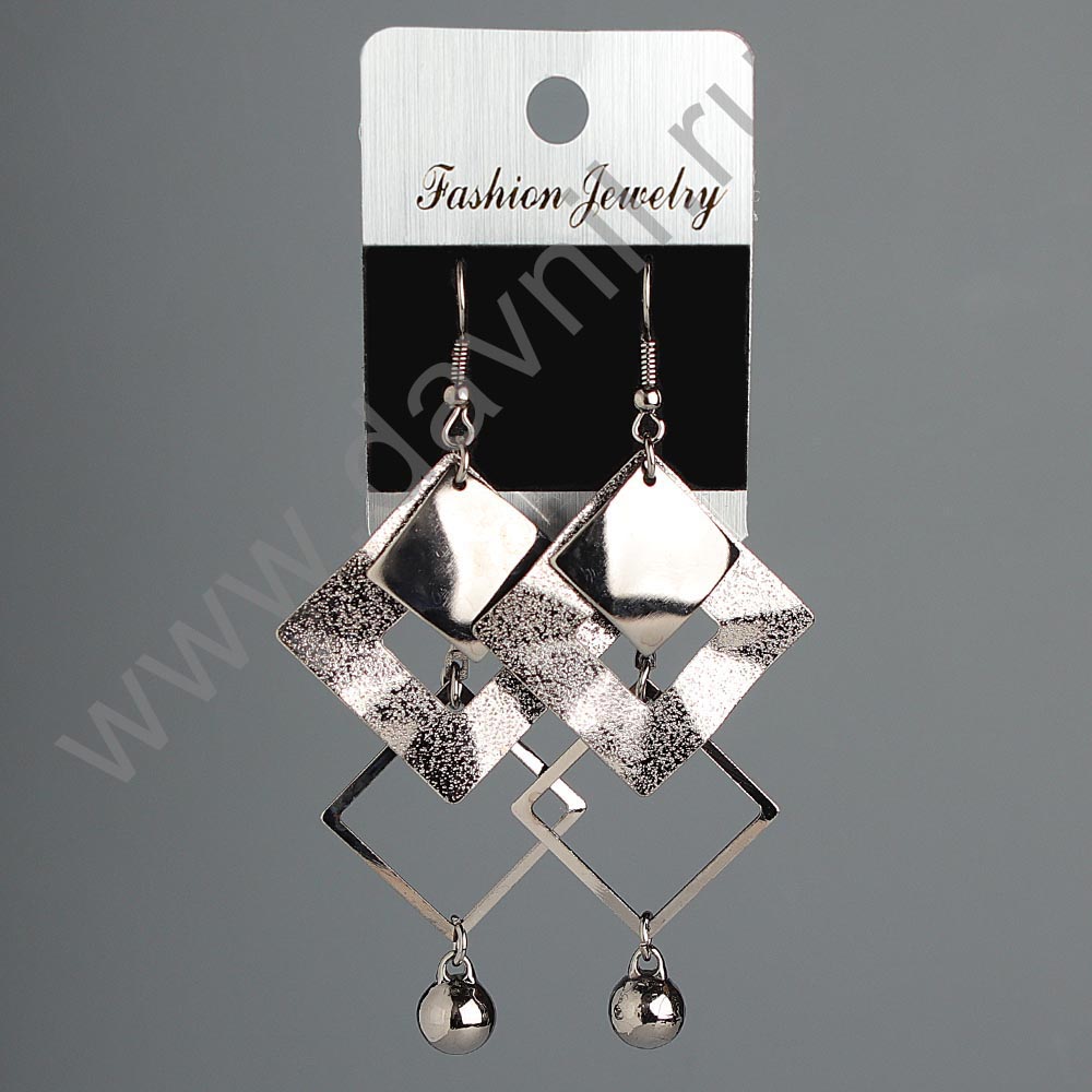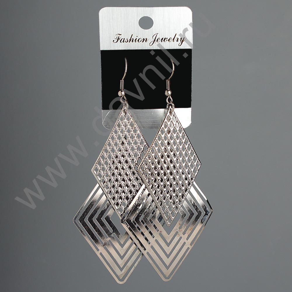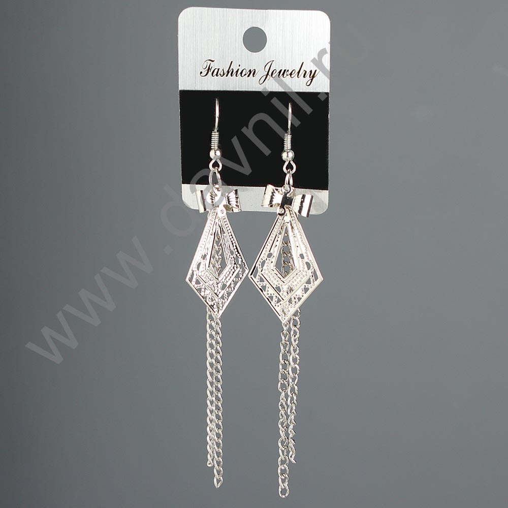 Серьги ромб ажурный под серебро 7 см с цепочкой