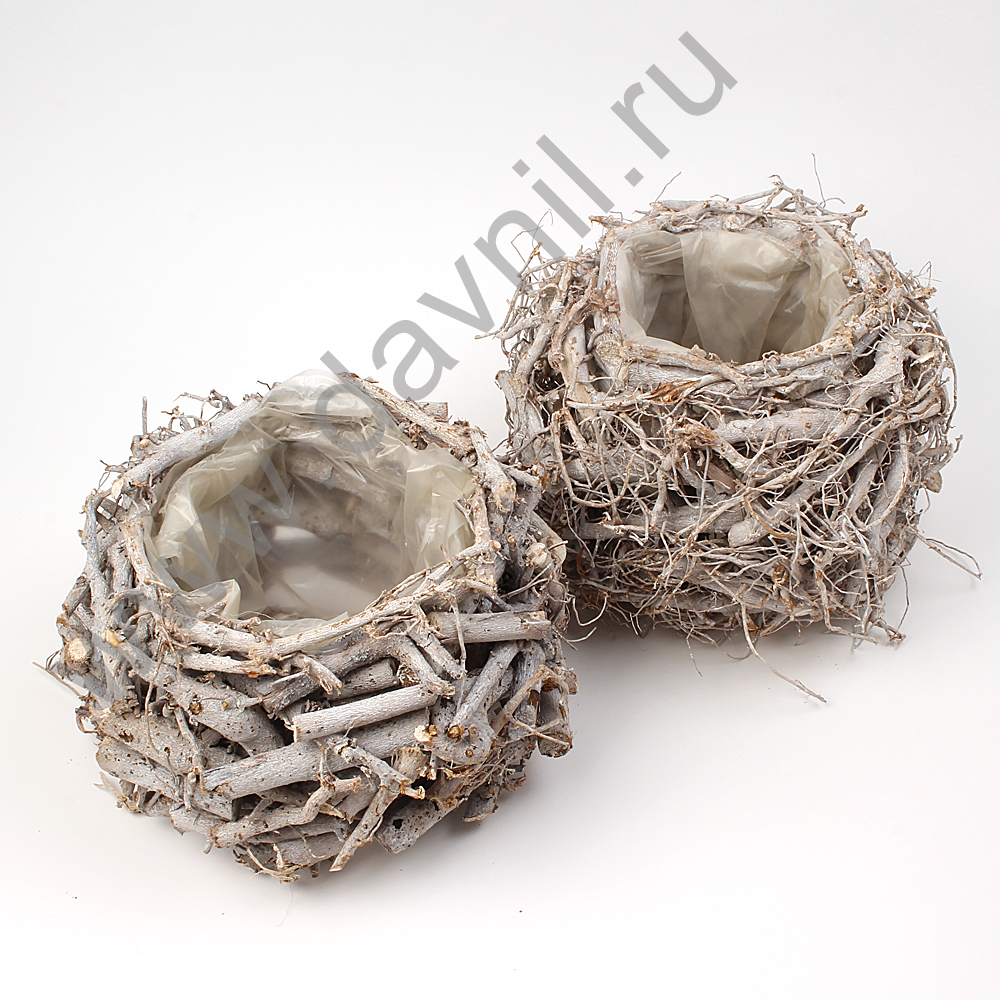 В наборе2 деревянных кашпо разного размера и диаметра: d=16 см; 13,5 см. Один кашпо из набора дополнительно декорирован длинными тонкими засушенными веточками.