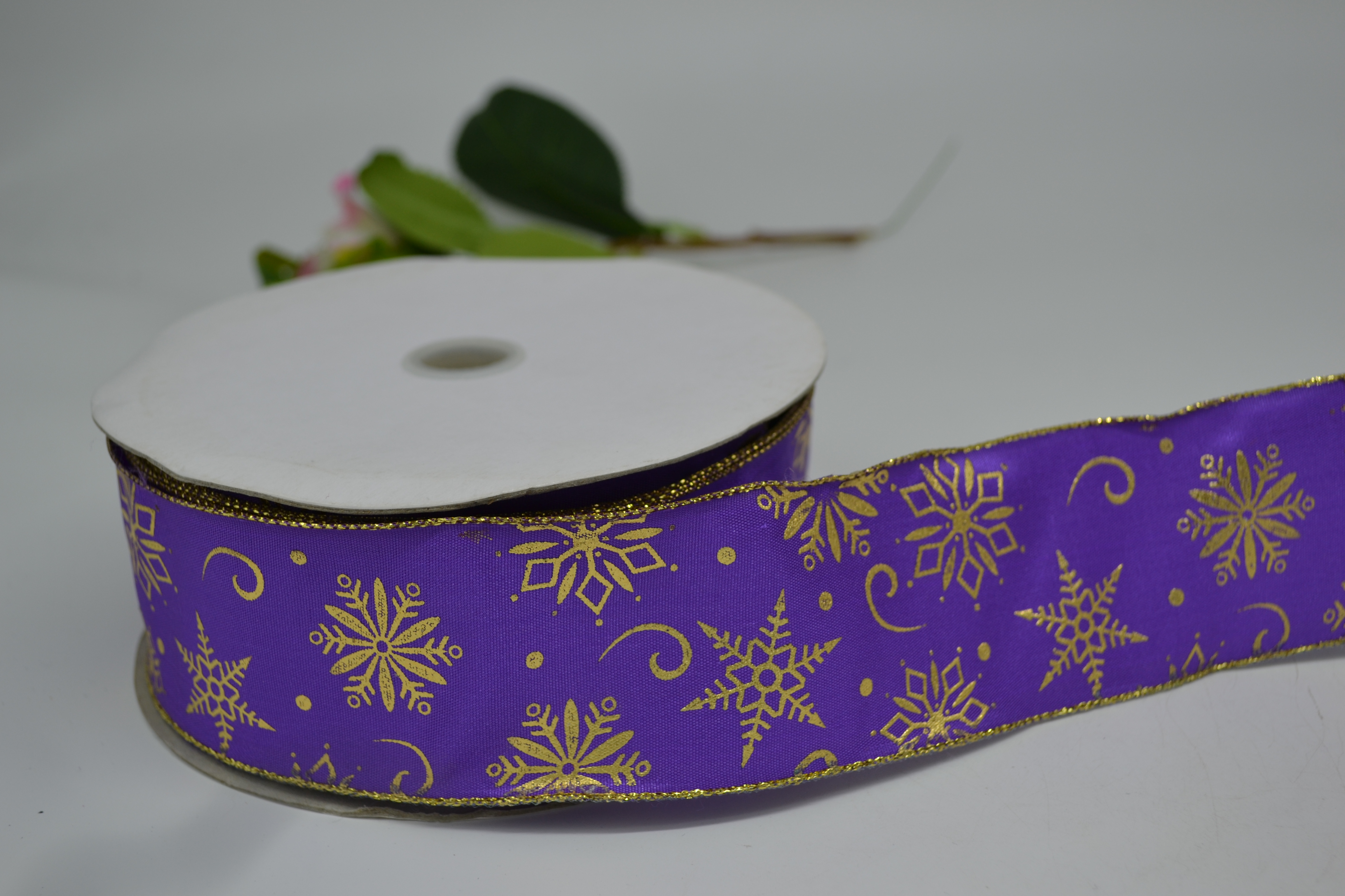 Лента сетка 5 см 30 ярдов сиреневая с золотыми снежинками