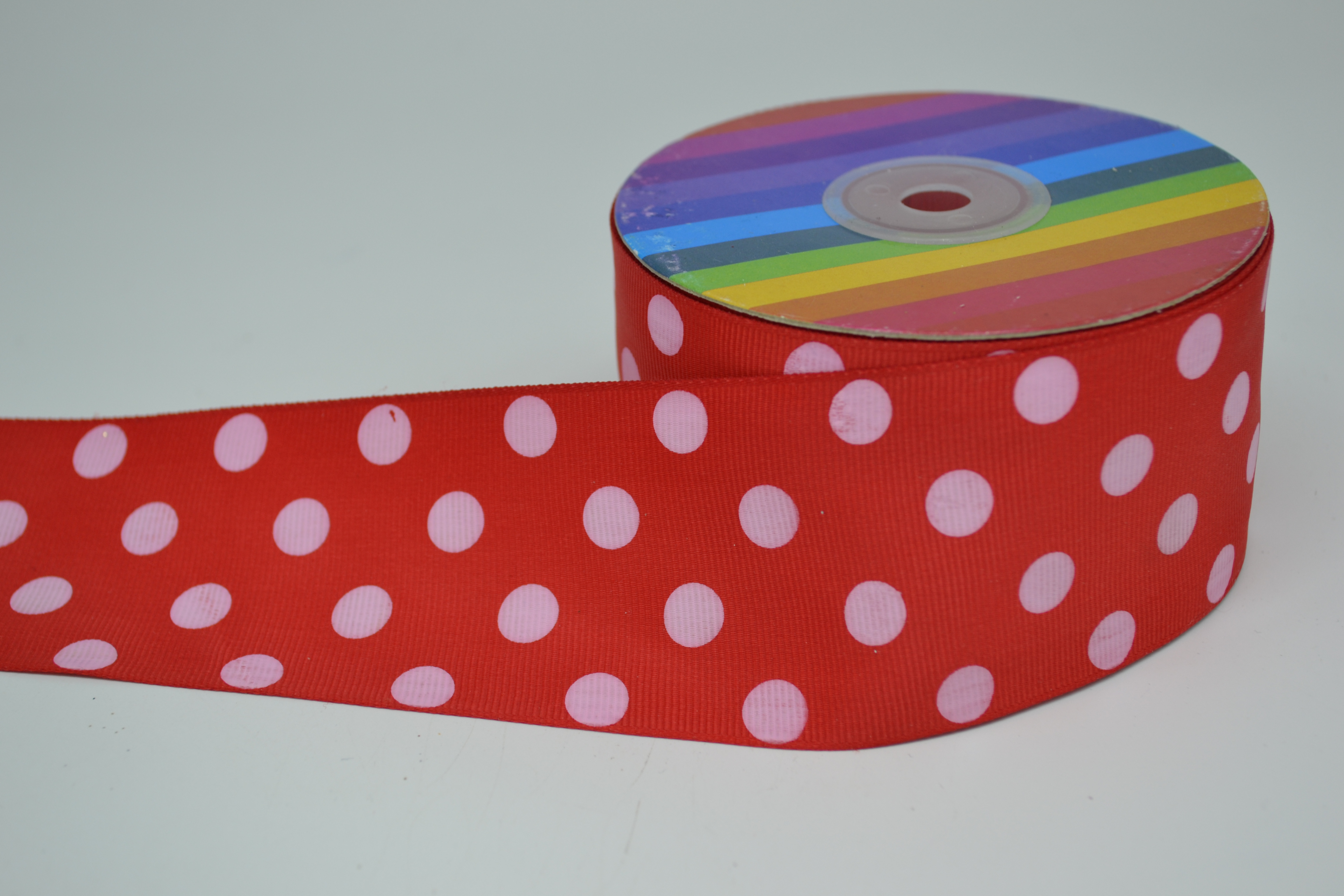 Лента репсовая 5,3 см 25 ярдов красная в белый горошек