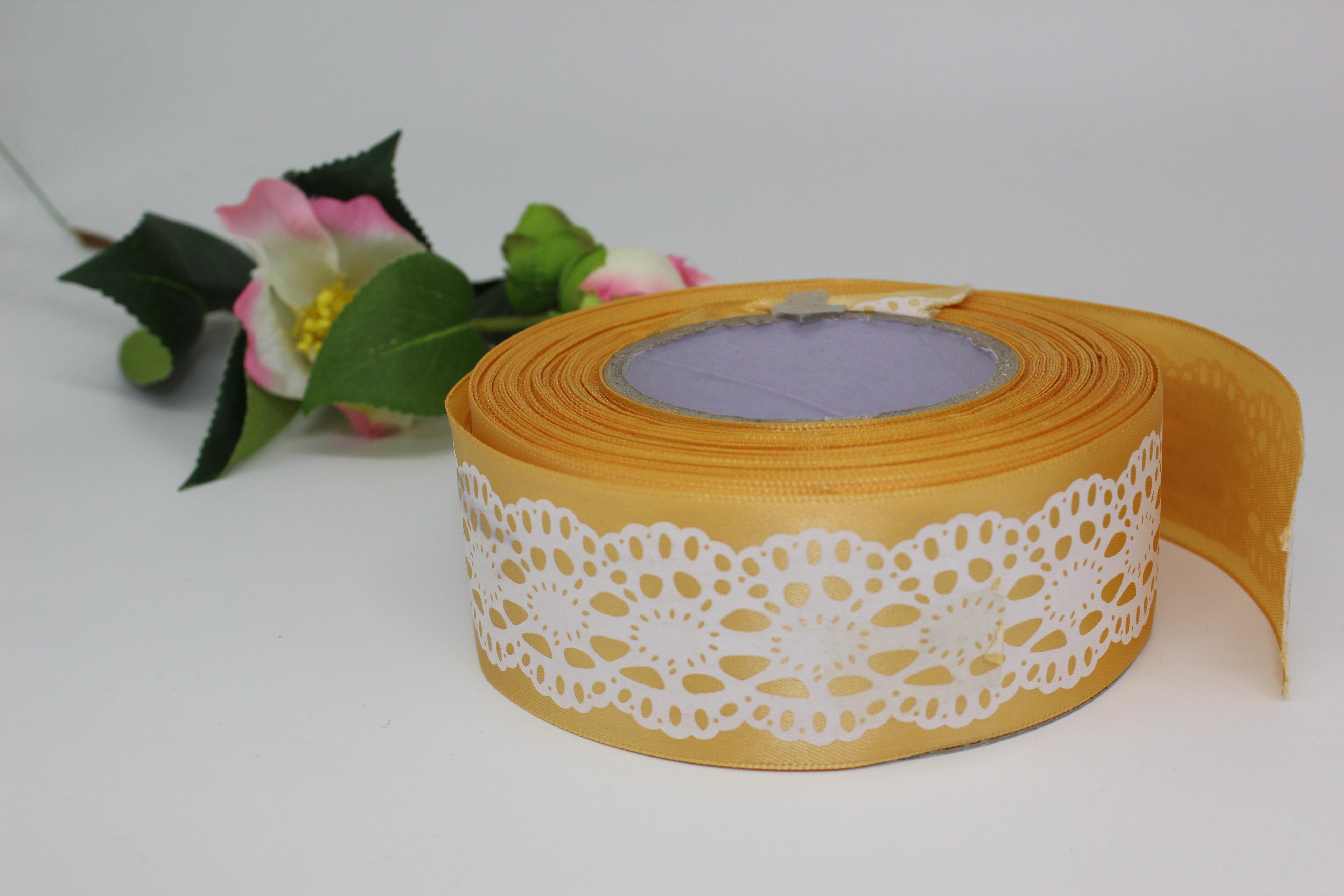 Лента атласная 4 см 25 ярдов с круживным рисунком бежевая