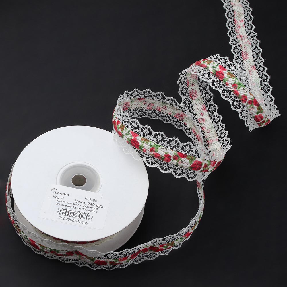 Лента тканевая с кружевной окантовкой 2,5 см 20 ярдов с красными цветами