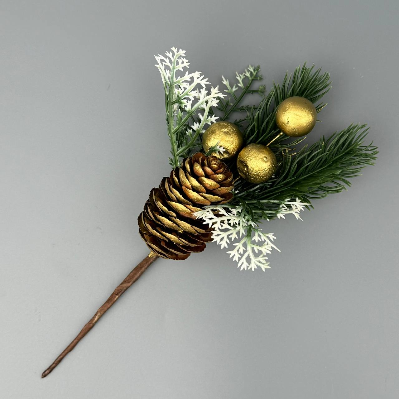 Новогодняя веточка с золотыми шариками и шишечкой 18 см