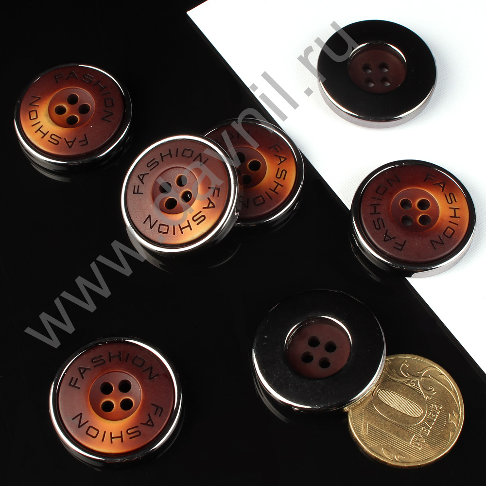 Пуговица 25 мм коричневая с надписью и серебряным ободком 10 шт